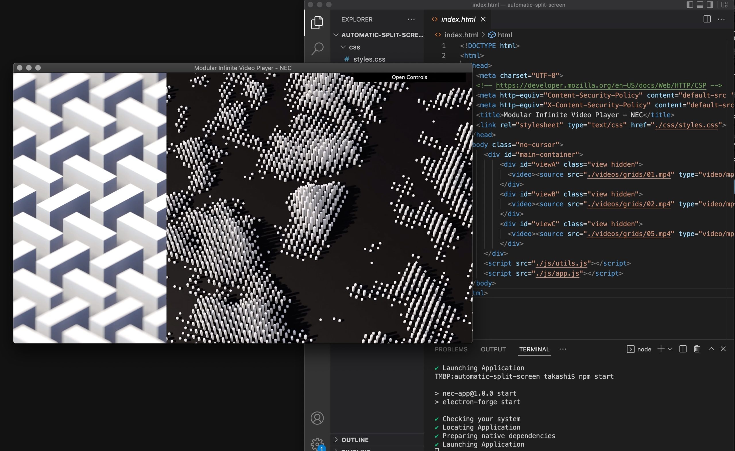 「NECが持つ先進性」と「九州という土地が持つ自然や伝統文化」をモチーフに、独自開発したソフトウエアによって、それらのビジュアルが常に変化し自動生成される仕組みを構築した。タイポグラフィ、モーショングラフィックス、実写映像素材の3つの要素に対し、各種パラメータを細かく定義できるような設計を施すことで、コンピュータによる自動生成映像の中で全体のトーン&マナーの維持を可能にした。