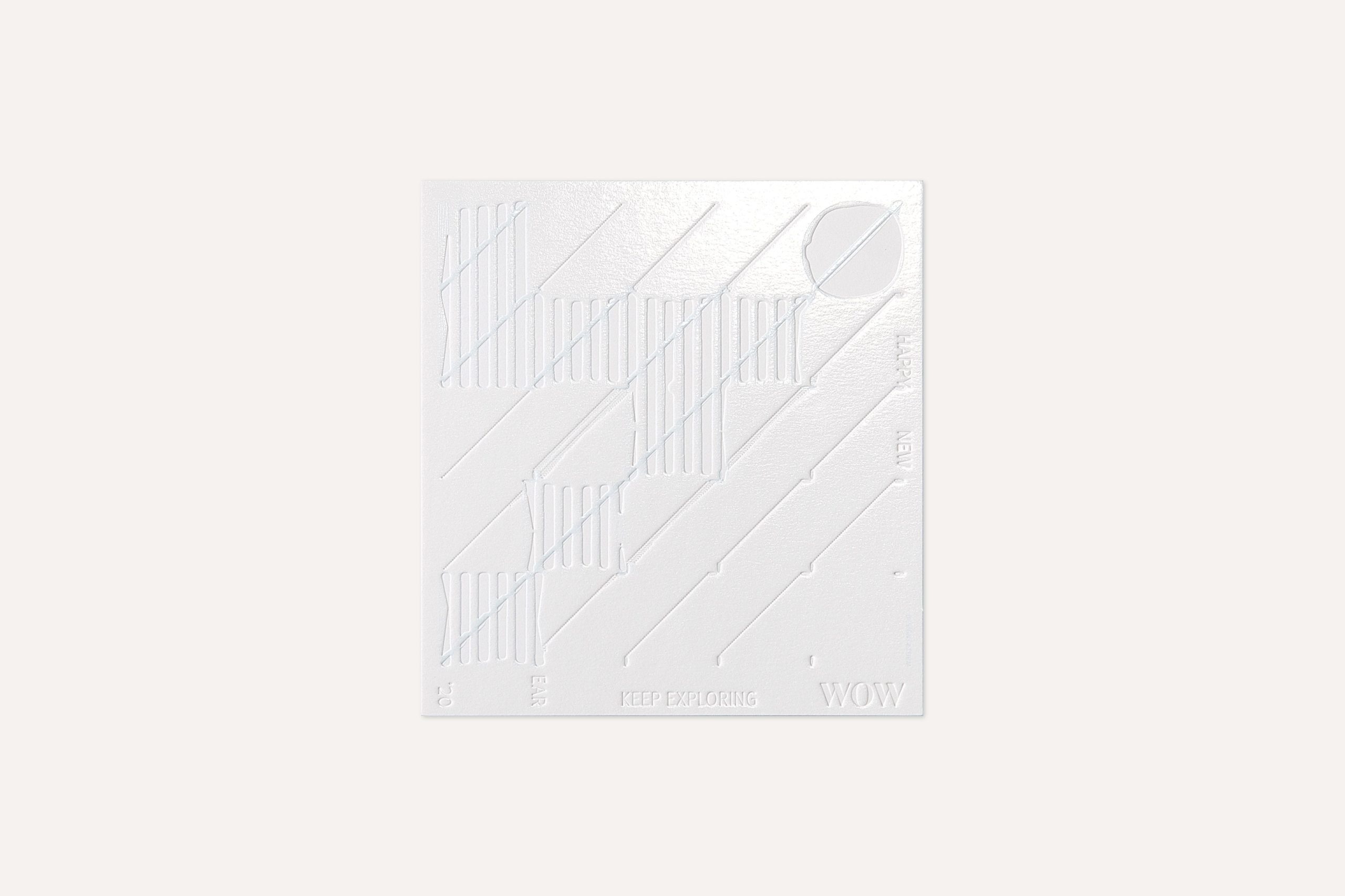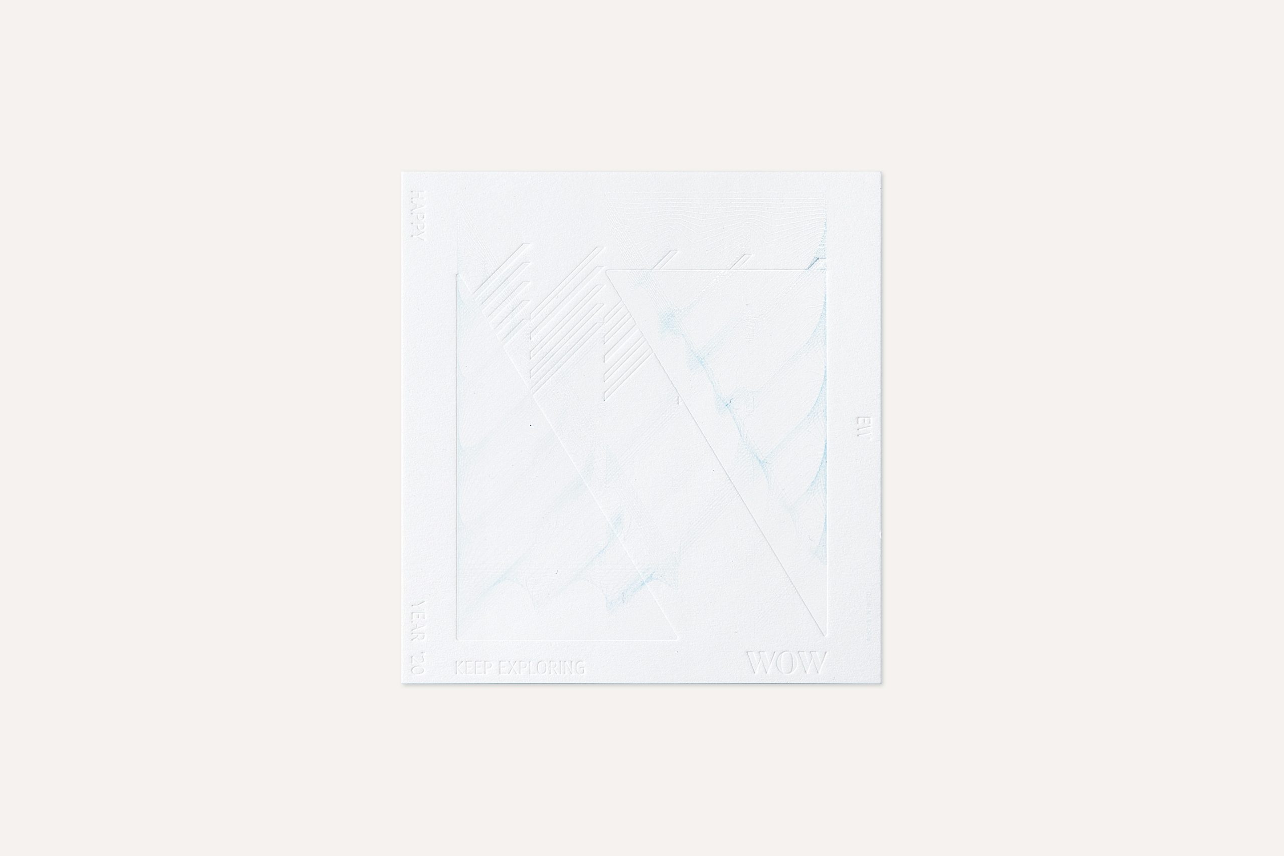 Happy New Yearのそれぞれの頭文字を2種ずつデザインし、プログラミングを用いてその一つの文字からもう一つの文字へと変容していくプロセスを表現した。印刷はオフセット、シルクスクリーン、エンボス、と異なる工程を駆使して熟練の職人達が1枚ずつ手作業で合わせて仕上げた。デザイナー、テクノロジー、そして印刷職人のそれぞれのプロセスを融合した、作為的ではない美しさを表現しようと試みた。