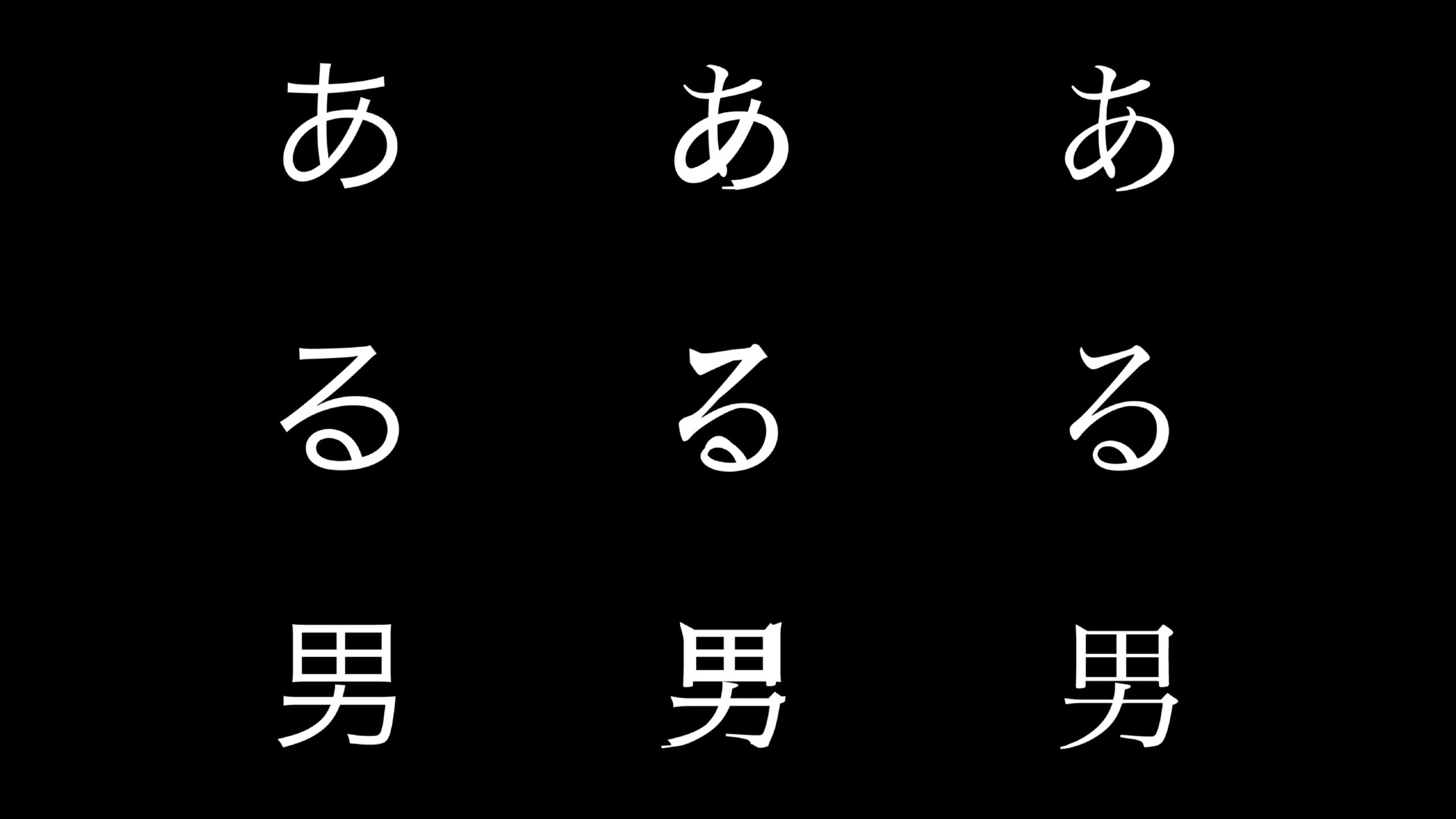 友人や職場、家庭においてなど人は誰しもひとつの人格ではなく、その狭間で揺れ動きながら生きているのかもしれないと映画から感じたため、日本語の明朝体でもゴシック体でも表現出来ない、その中間地点を模索しながらタイトルをデザインした。モーション部分はコーディングデザインを用い、始点である明朝体からデザインした明朝体とゴシック体を混ぜたデザインを通り、終点であるゴシック体に帰結させた。