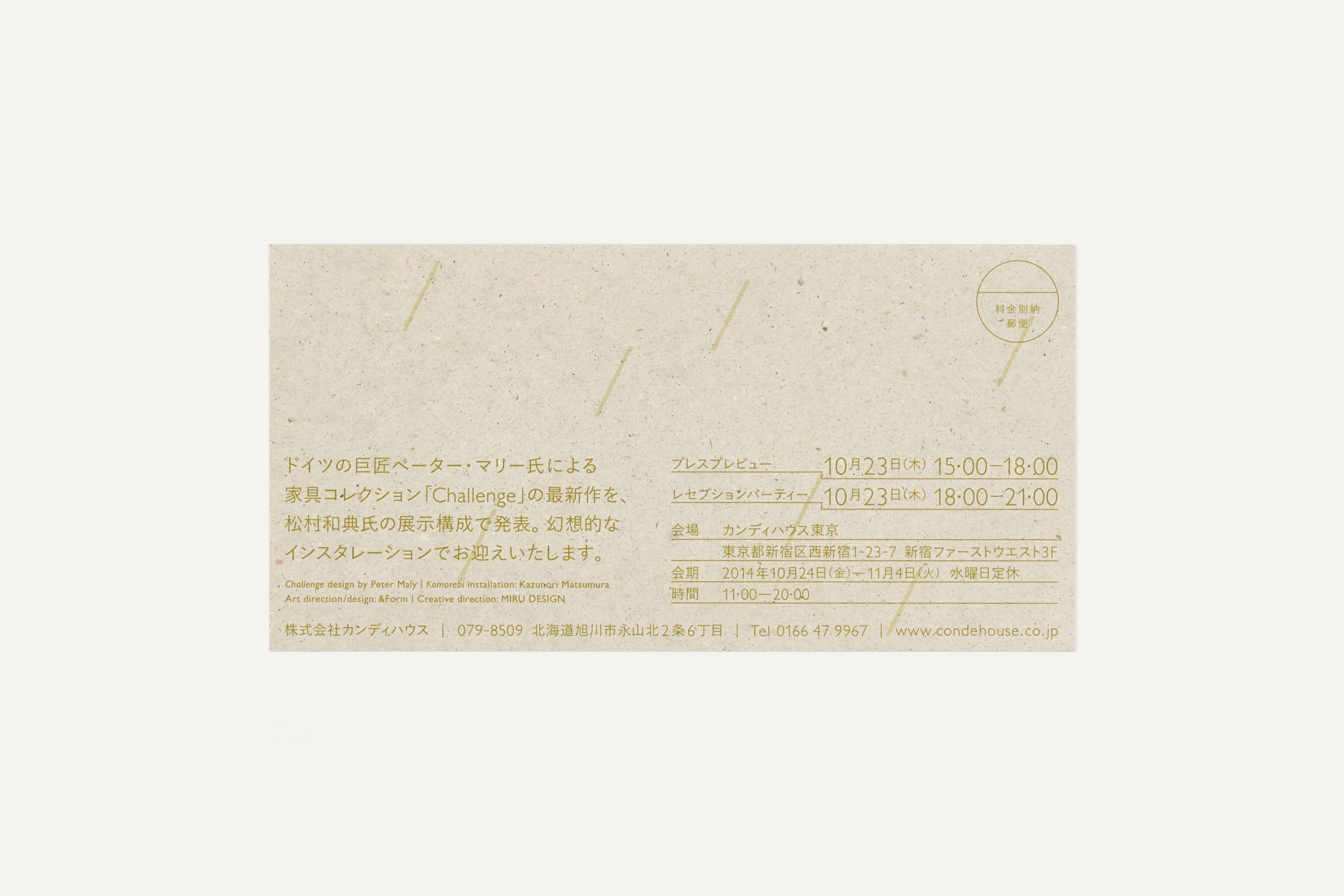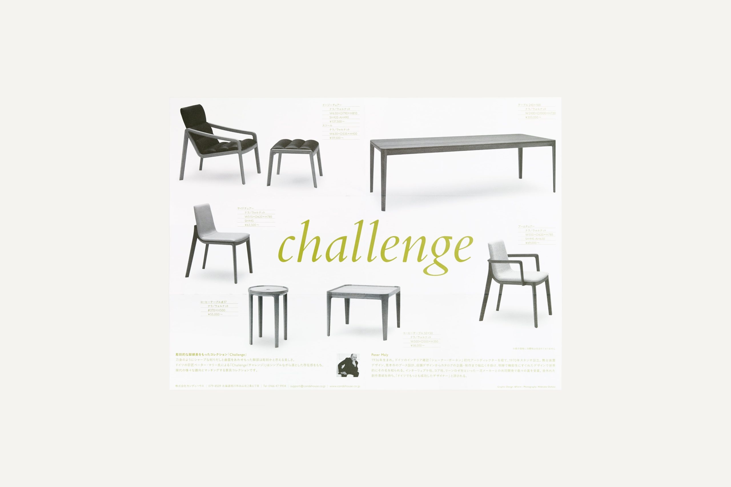 ドイツ・デザイン界の巨匠ペーター・マリー氏が手がける、カンディハウスの家具コレクション「Challenge」のリーフレット及び、発表会となるイベント「Komorebi at CONDE HOUSE」の招待状を担当した。