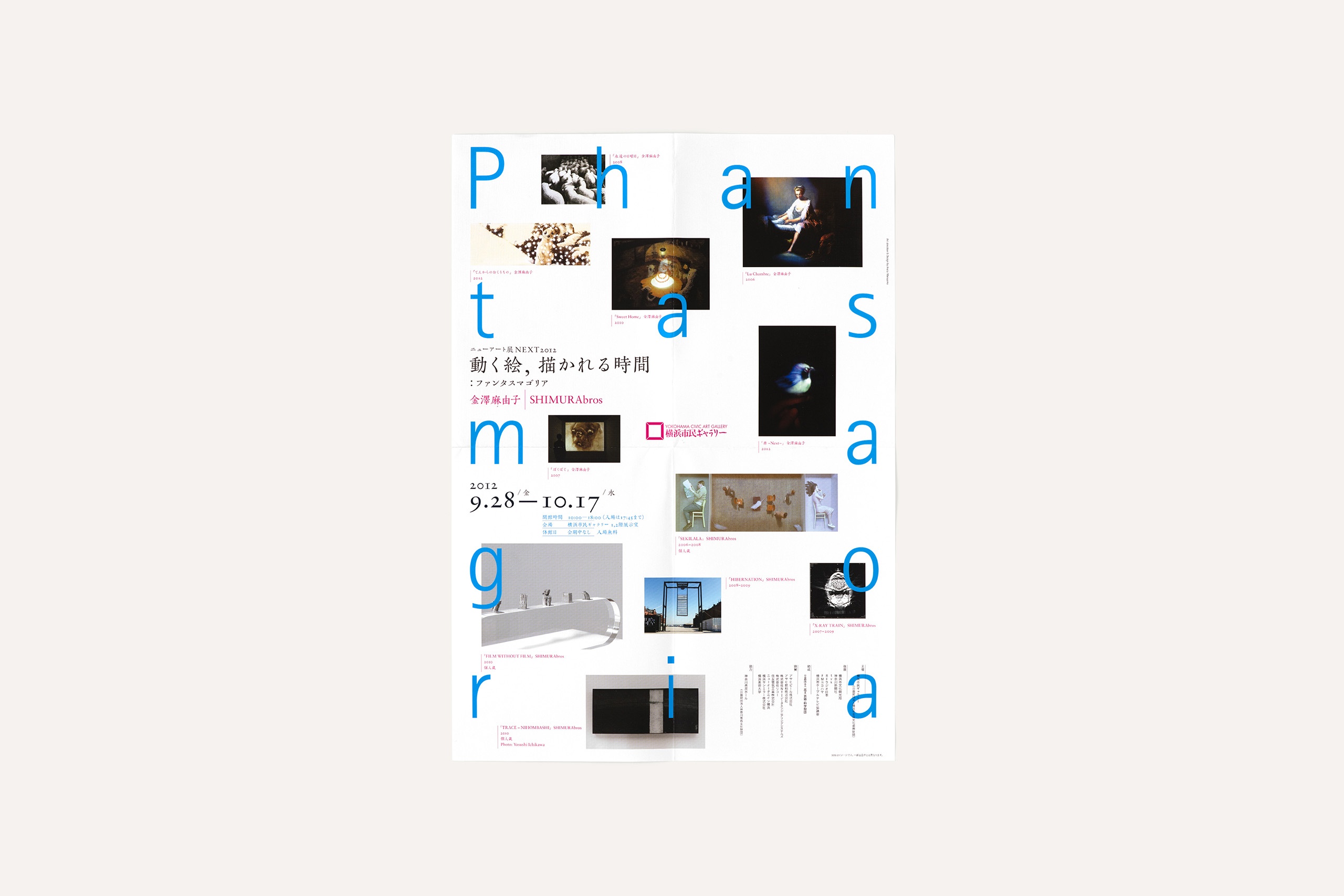 作品、空間、時間、鑑賞者の相関関係に注目し、映像表現の多様な展開を見つめるという展覧会の主旨から、ポスターには多くの作品を散りばめ、多様性を表現した。カタログは、2人展という特性から発想し、一方を右開き、もう一方を左開きでレイアウトすることで平等性を保ち、真ん中のページで2作家が落ち合うようにデザインした。ジャケットは、透明のビニール素材に施した白のシルク印刷が本体カバーのシアンと重なるデザインによって、映像が透過していくイメージを想起させることを狙った。