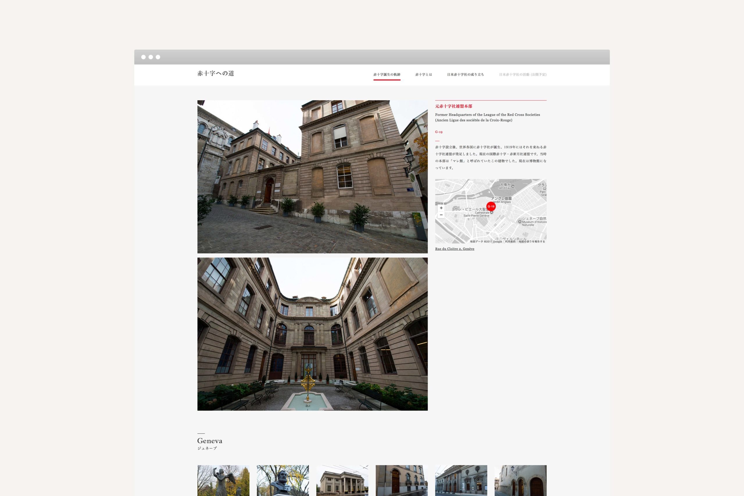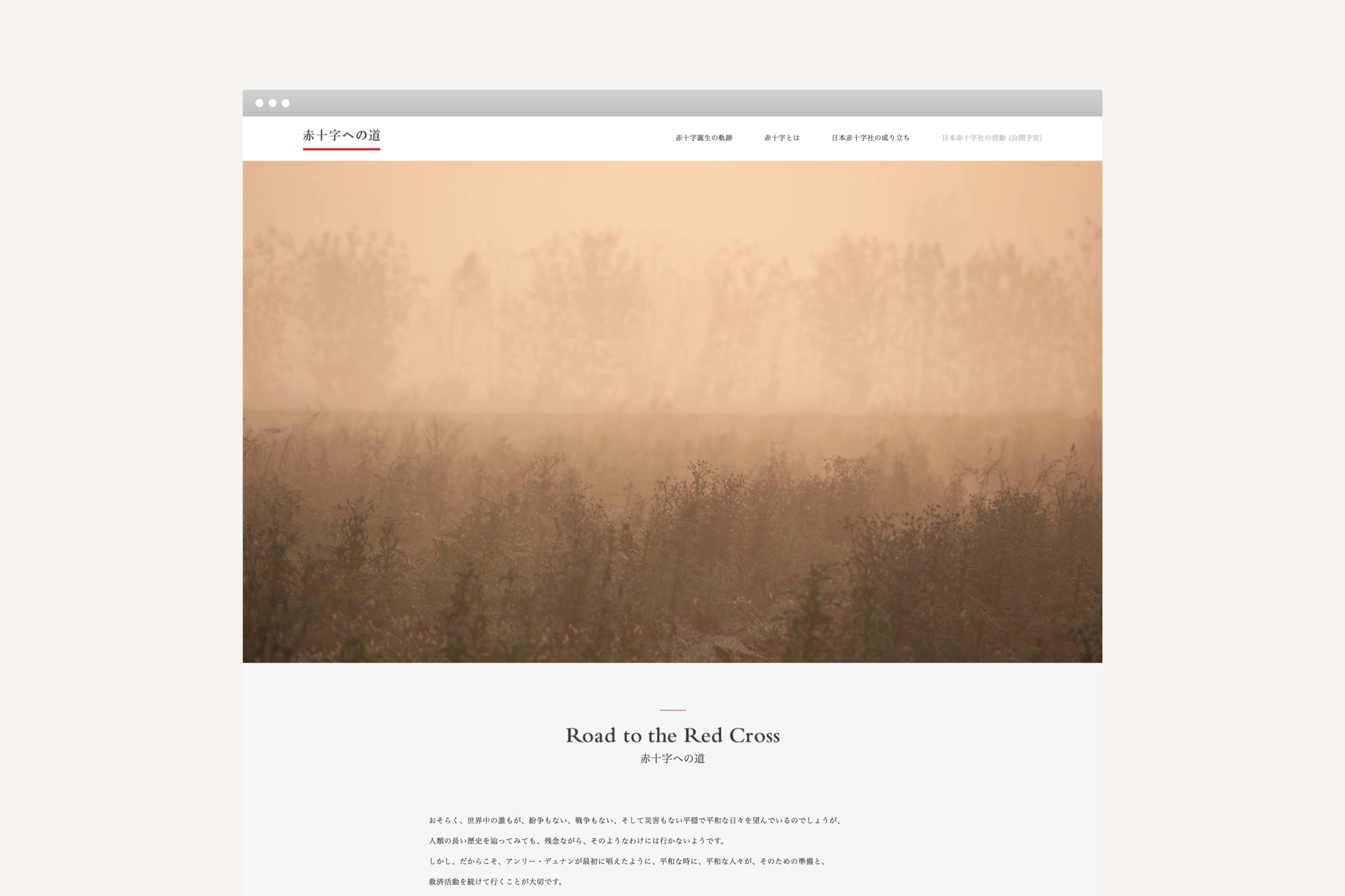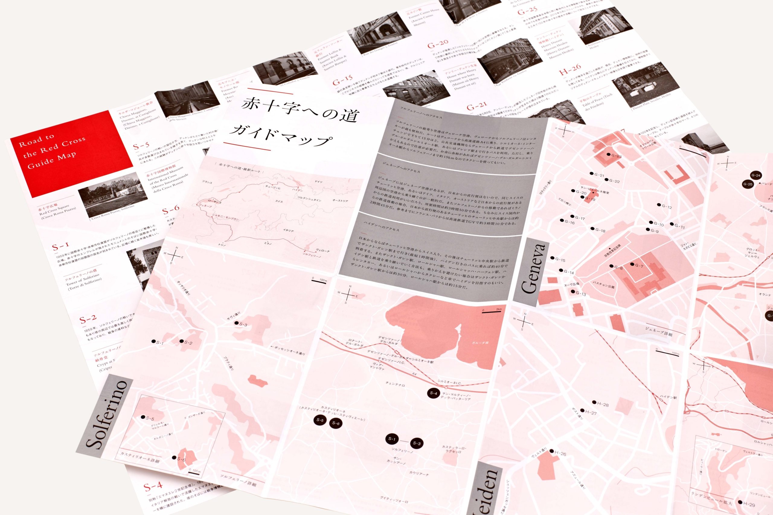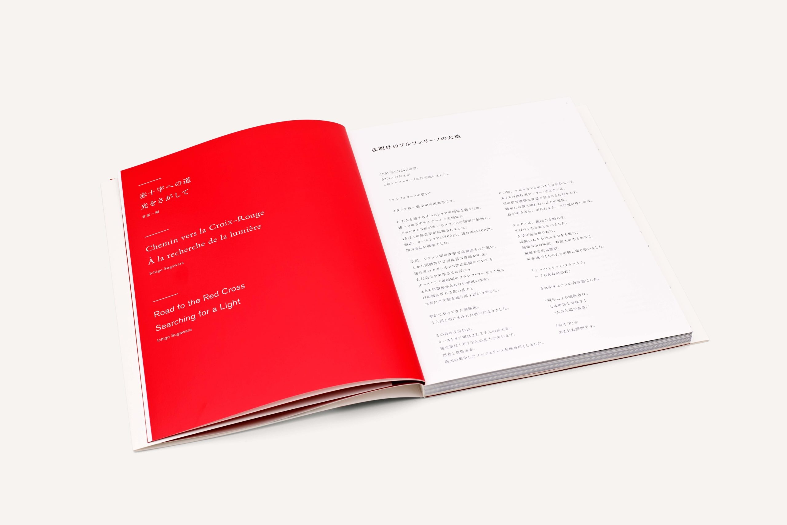 赤十字社創設に至るまでの軌跡をまとめた写真集『赤十字への道』では創設者デュナンの歩みや想いを写真で読み解く流れのなかにエッセイが入る構成を主体とし、赤十字社の背景や理念などは後半部を中心に構成。写真集と連動したウェブサイトや写真展も開催するなど多岐に渡る展開を手掛けた。