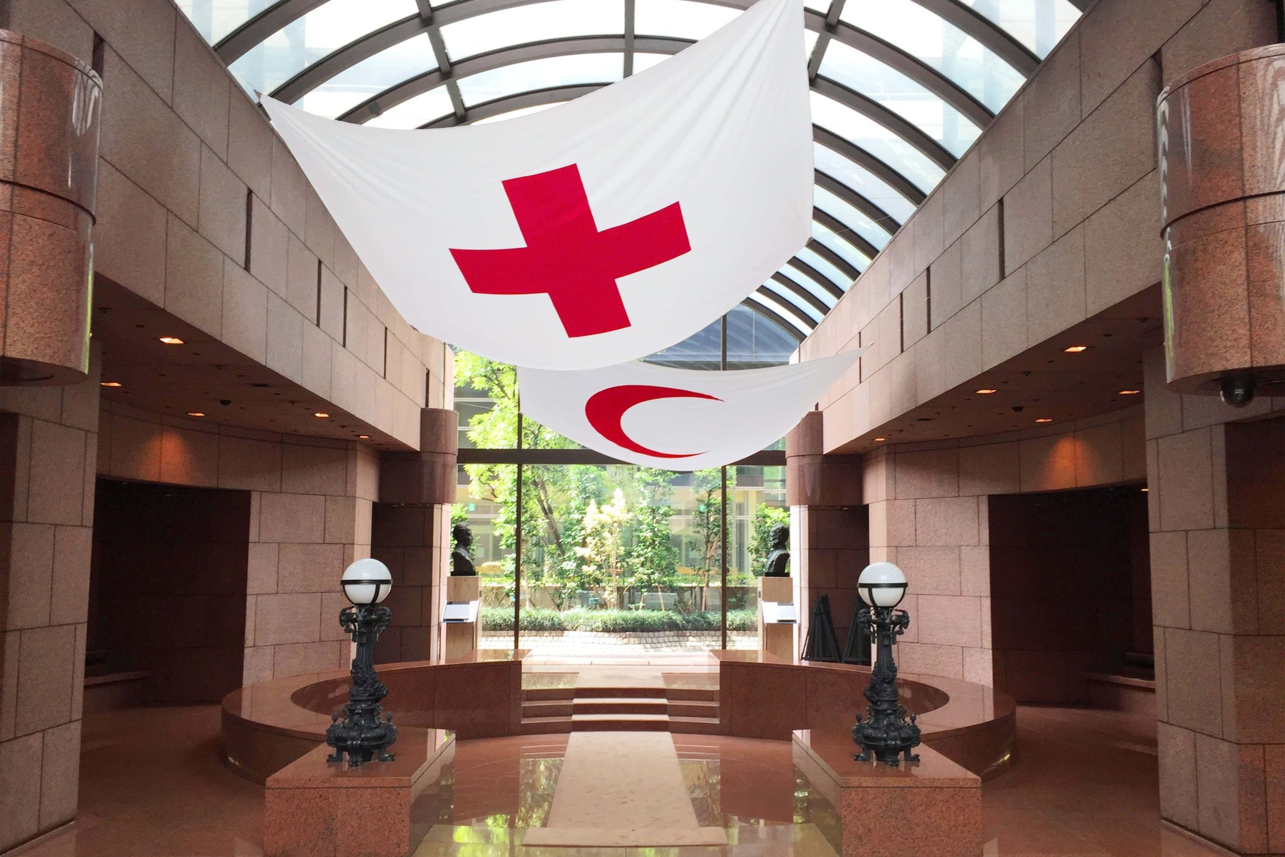 本社入り口のリデザインにおいては掲示されていた雑多で様々な広告物を取り除き、空を仰ぐ吹き抜け空間に赤十字社を象徴する二つの標章を大きく掲げ、本来の理念や想いが伝わるような空間造りを意識した。