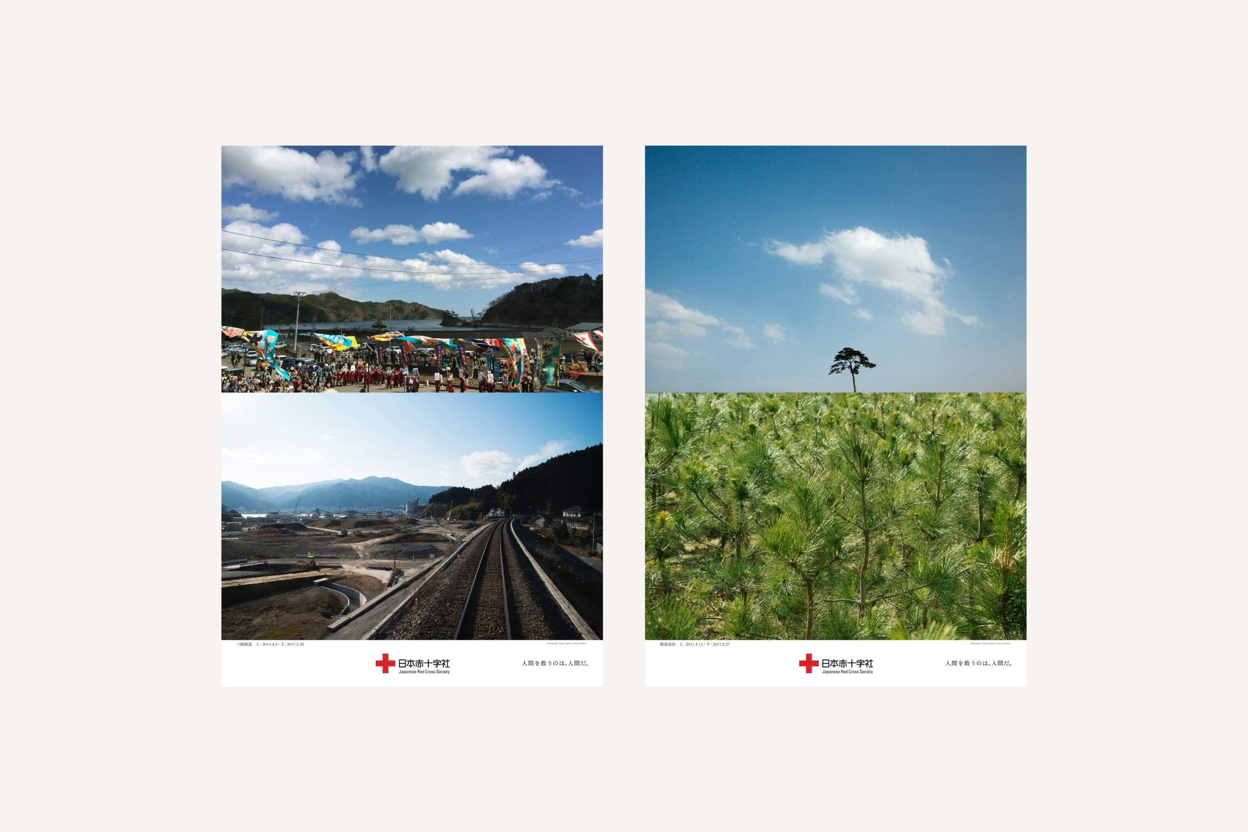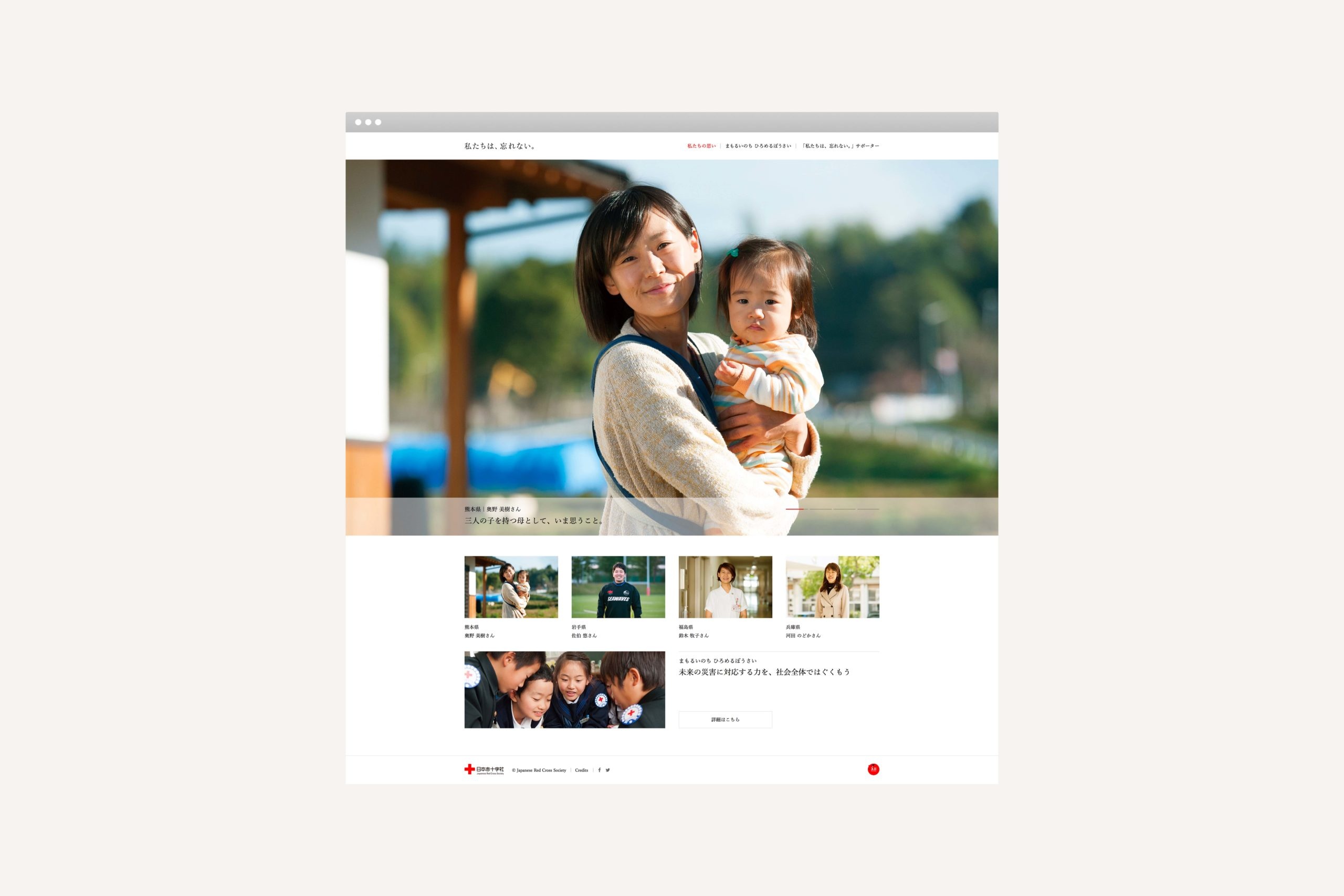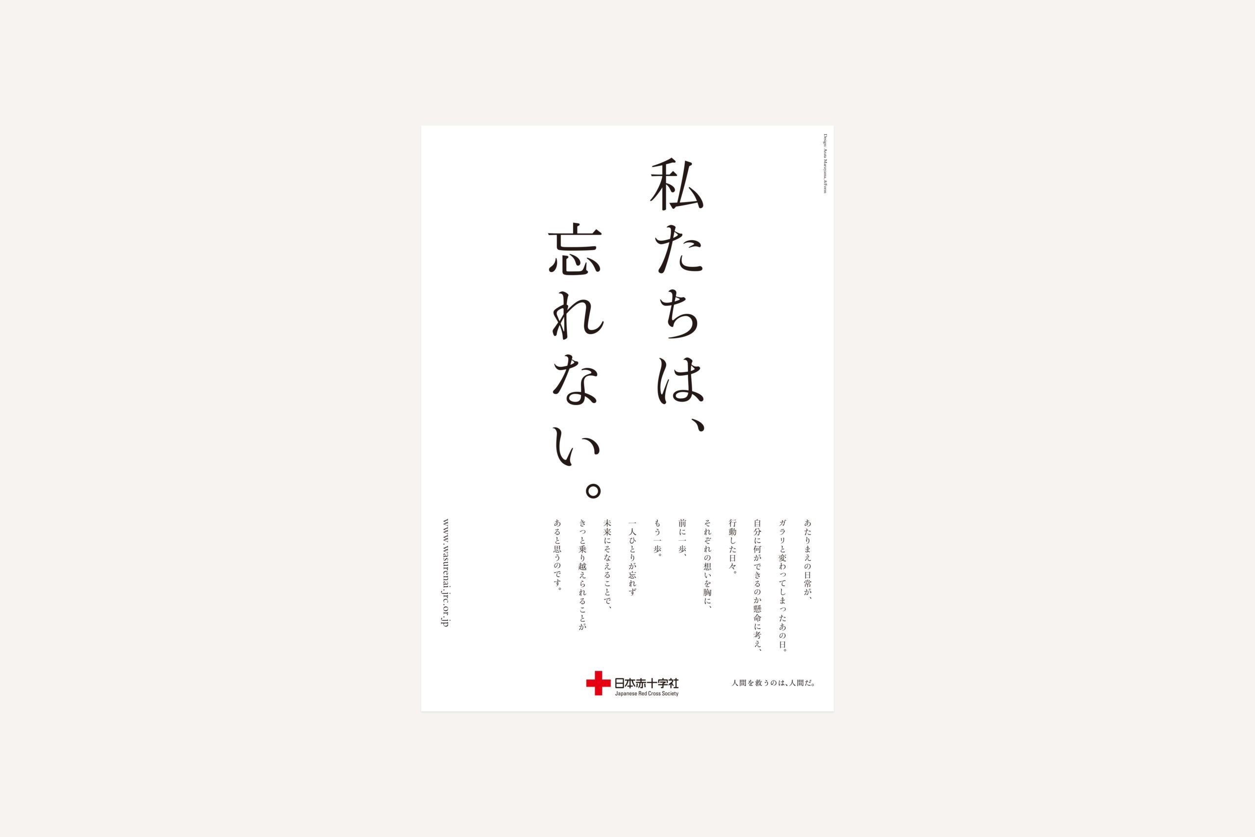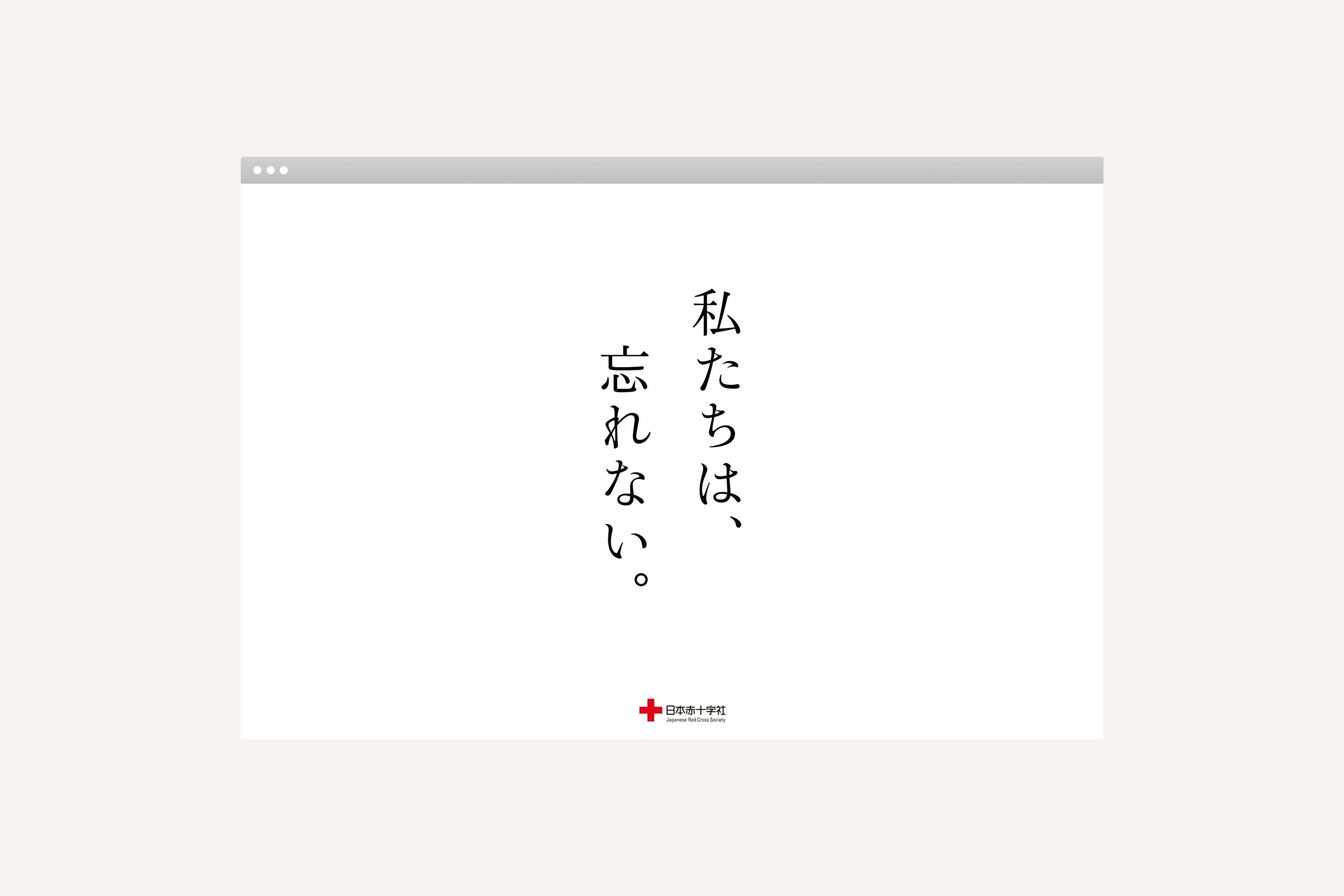 また、日本赤十字社の復興支援プロジェクト「私たちは、忘れない。」ではこれまでの災害による経験を忘れず、未来への教訓を繋げることをコンセプトに、東日本大震災をはじめ、被災した様々な立場の人々が当時の様子を振り返りながらも、いまを強く生きるメッセージを主軸としたメインヴィジュアル、印刷物、ウェブサイトなどを制作した。