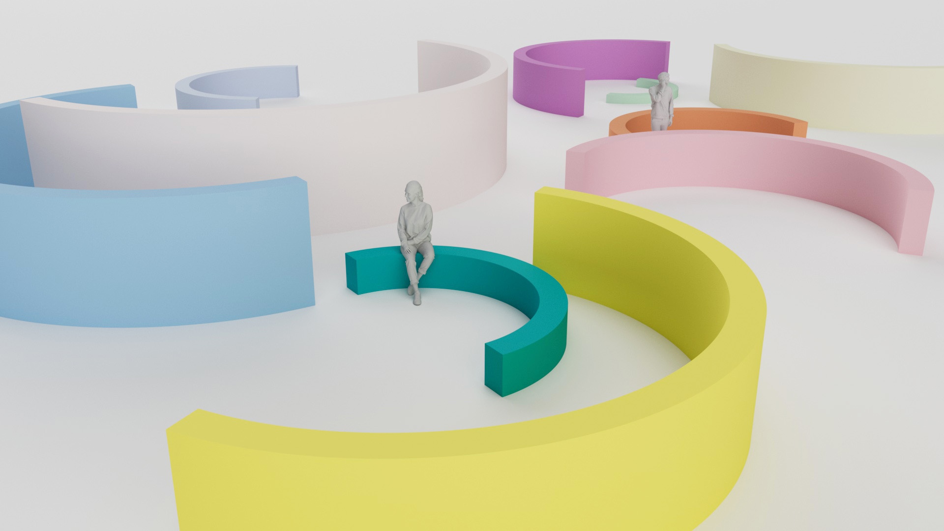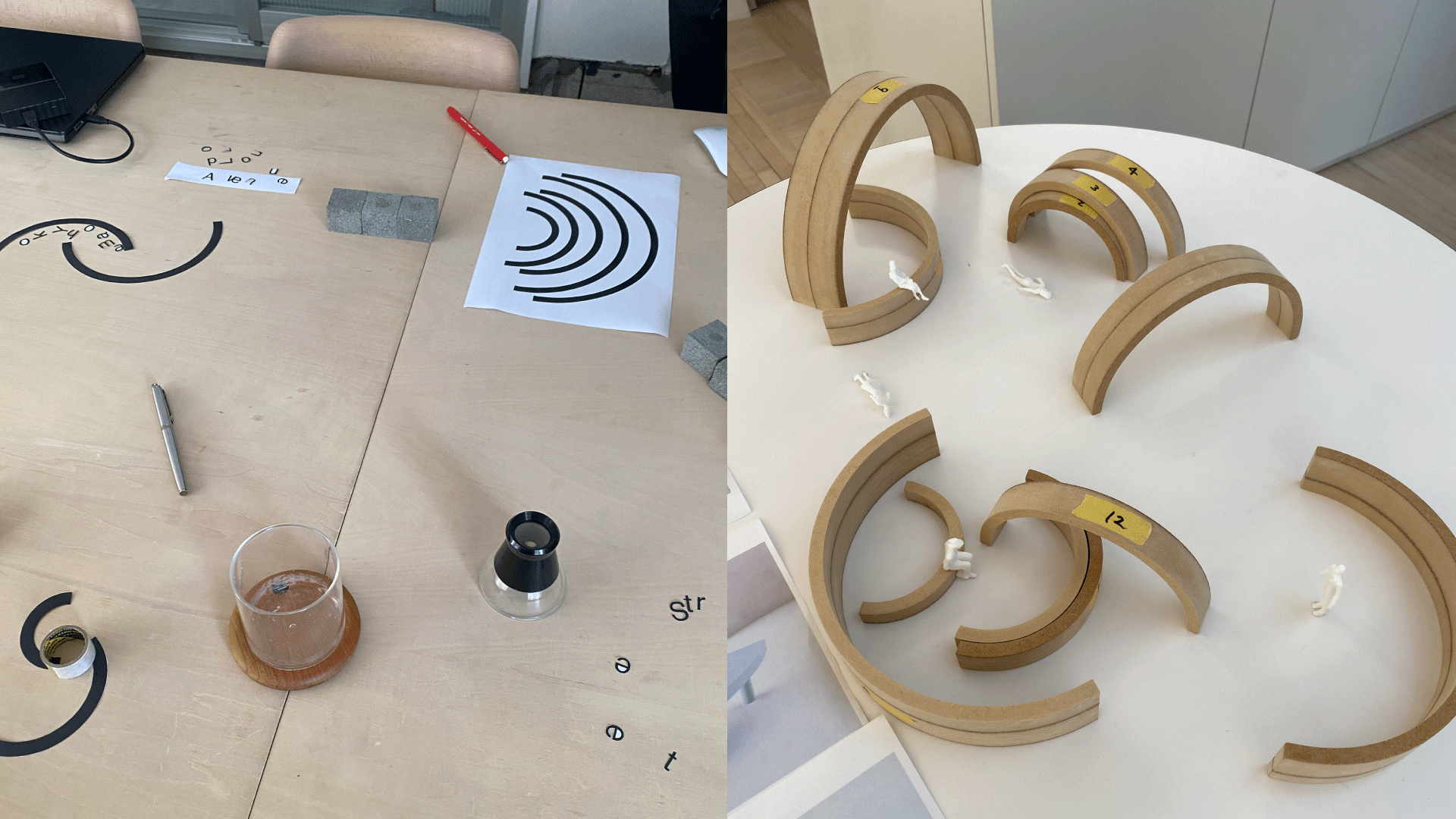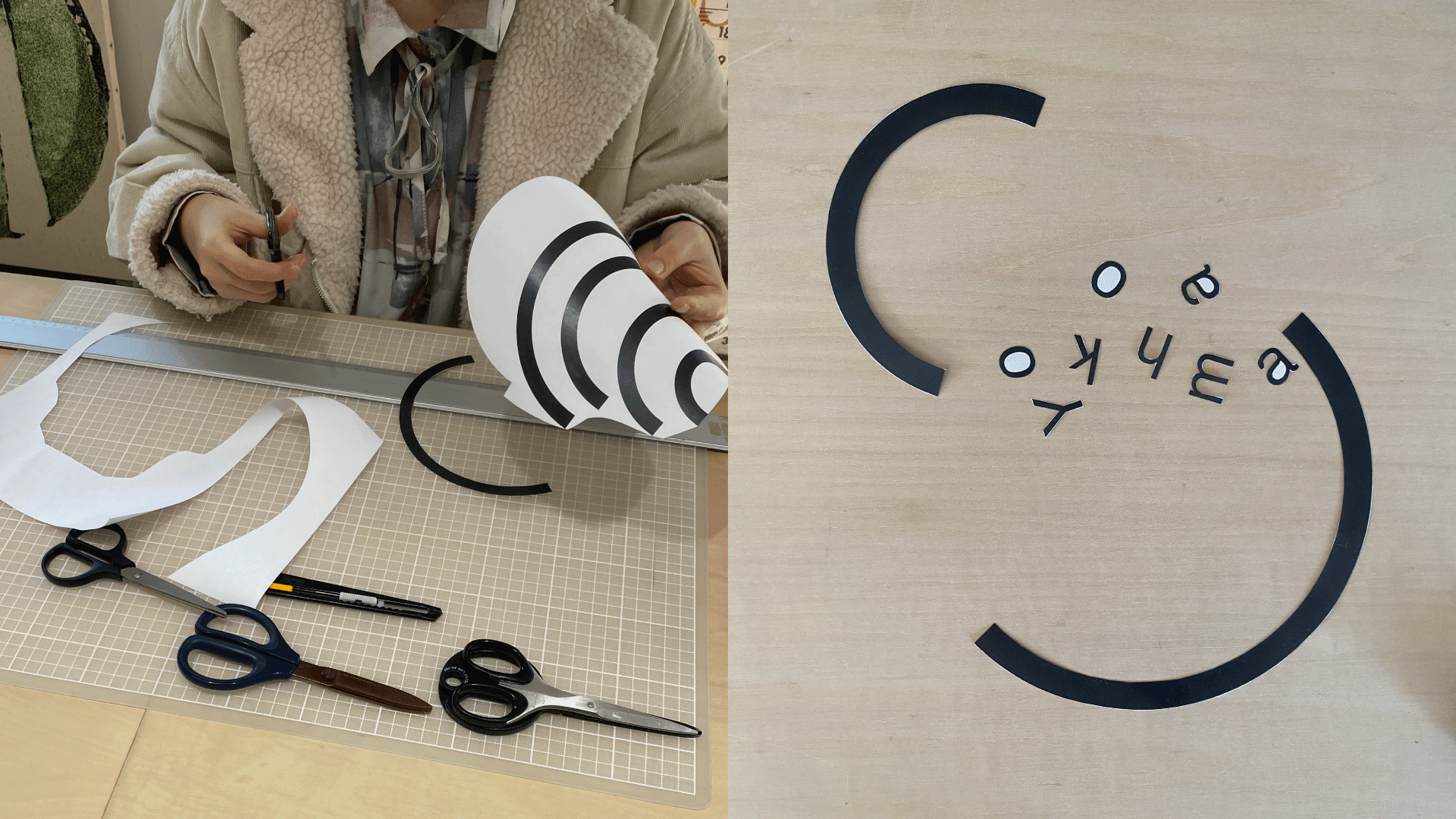 この構造を考える過程で、もうひとつのヒントとなったのが、制作初期にスケッチを行っていたテーブルの上の風景でした。半円のパーツや道具が無造作に並び、散らばった文字の断片が人の気配のように見え、その周囲を人が行き来する。その光景は、固定された配置ではなく、関心や対話によって人が集まり、離れ、また別の場所へ移動していく流動的な働き方のイメージと重なっていきました。